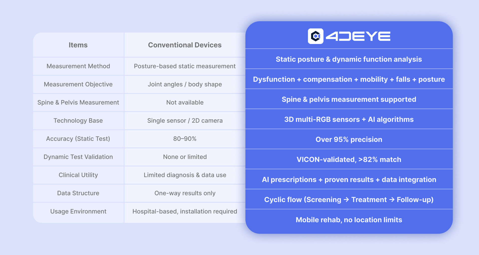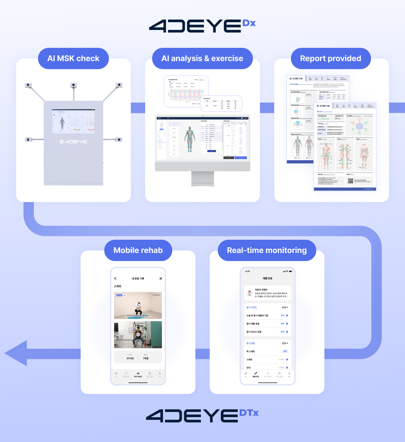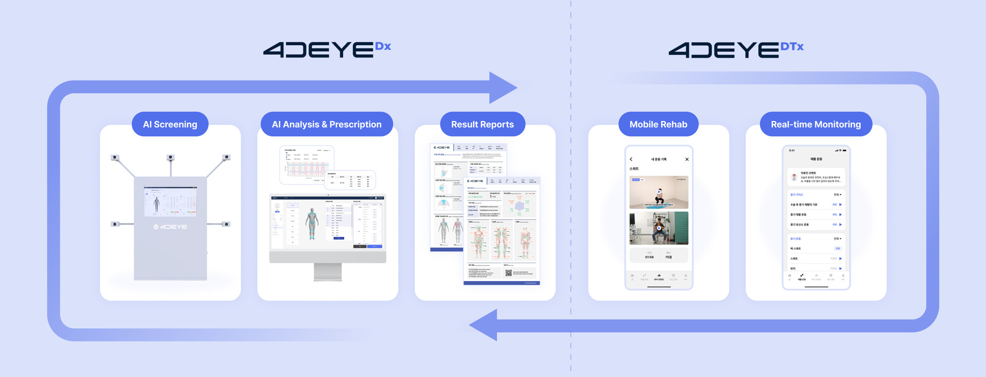 4DEYE is the first AI rehabilitation platform to seamlessly integrate screening and therapy. Through a cycle of screening → analysis → treatment → follow-up, we deliver personalized rehabilitation.