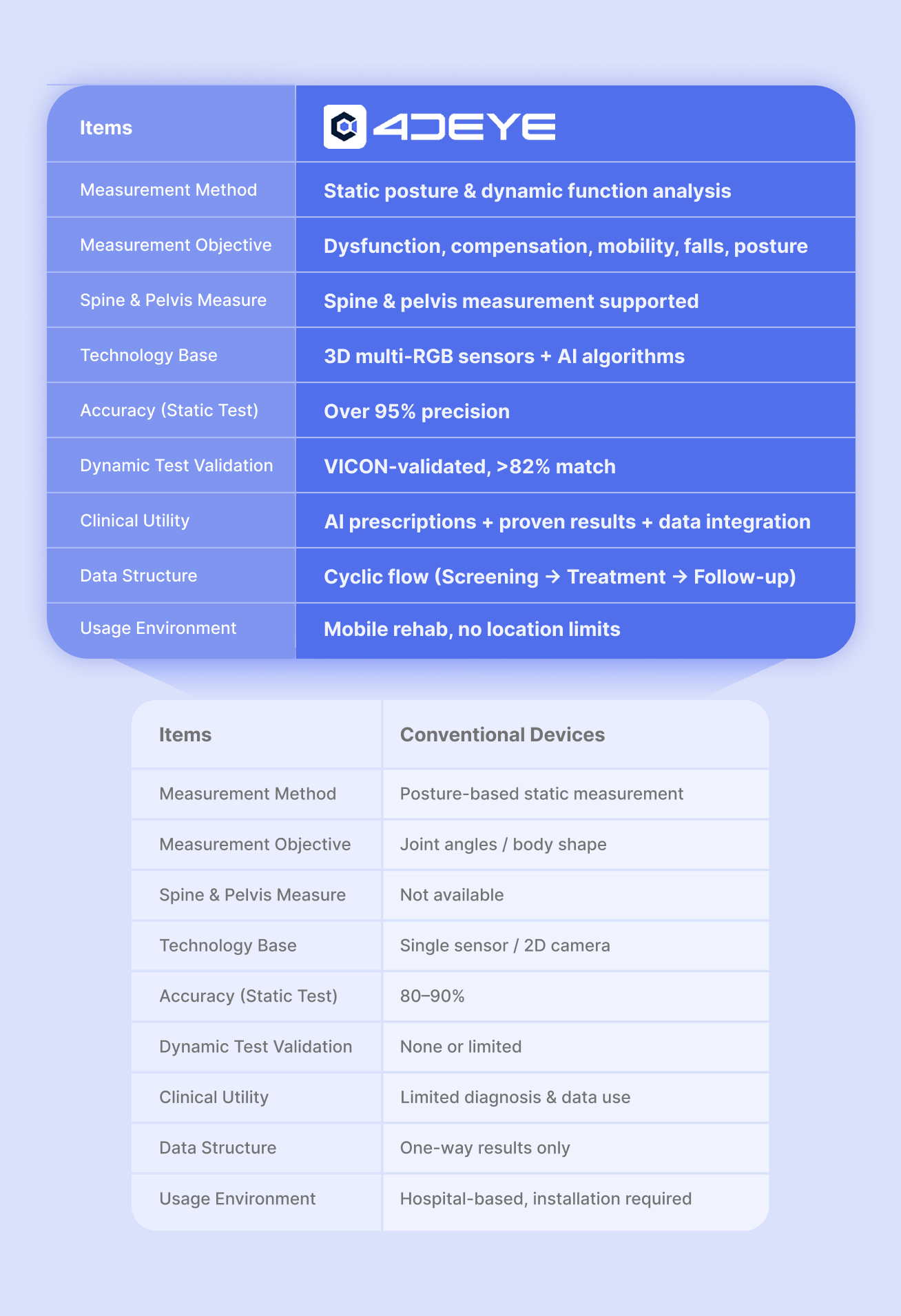 4DEYE Dx detects joint dysfunction and movement issues before pain or damage, delivering medical-grade reliability beyond simple posture analysis.